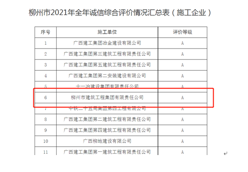 3月下旬,在柳州市住房和城鄉(xiāng)建設(shè)局發(fā)布的《2021年度柳州市建筑施工企業(yè)誠信綜合評價情況通報》中,柳建集團(tuán)以優(yōu)異的成績評為A級企業(yè),獲得通報表揚,并在我市建設(shè)工程招標(biāo)投標(biāo)活動中給予加分獎勵。
