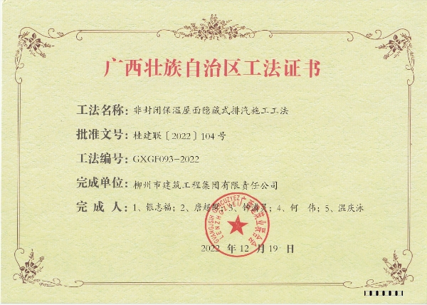 2022年12月19日,廣西建筑業(yè)聯(lián)合會發(fā)布《關(guān)于公布2022年廣西壯族自治區(qū)級工程建設(shè)工法名單的通知》,我司申報(bào)的《高層建筑鋼筋砼結(jié)構(gòu)連梁施工工法》和《非封閉保溫屋面隱藏式排汽施工工法》2個(gè)工法榜上有名。這是對柳建集團(tuán)公司工程技術(shù)人員工法編制能力的充分肯定,也是集團(tuán)公司一直以來對加強(qiáng)工法的研發(fā)和應(yīng)用,加快技術(shù)積累和科技成果轉(zhuǎn)化,增強(qiáng)集團(tuán)公司科技創(chuàng)新能力和企業(yè)的核心競爭力堅(jiān)守的成果,為公司提高工程質(zhì)量管理,建造精品工程奠定了堅(jiān)實(shí)基礎(chǔ)。
