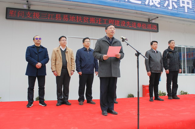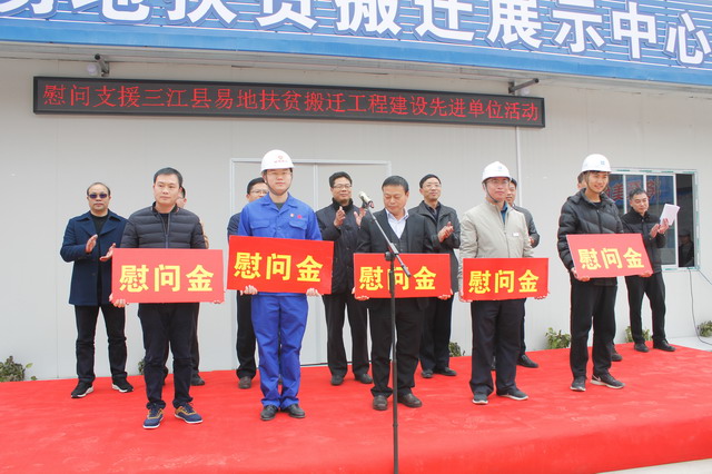 2月11日下午,在三江縣異地安置扶貧移民項(xiàng)目工程(柳建集團(tuán)公司項(xiàng)目部的辦公區(qū)域)展示廳外大門前,紅色的地毯鋪在簡(jiǎn)易的舞臺(tái)上,柳州市委領(lǐng)導(dǎo)、三江縣委領(lǐng)導(dǎo)以及相關(guān)部門的領(lǐng)導(dǎo),在此進(jìn)行慰問支援三江縣異地扶貧搬遷工程建設(shè)先進(jìn)單位活動(dòng)。會(huì)上,市委梁副書記、縣委袁書記對(duì)柳建集團(tuán)公司、區(qū)建五公司、冶建公司等施工單位給予了很高的評(píng)價(jià),感謝各施工單位在全區(qū)的異地安置扶貧移民項(xiàng)目工程中,為柳州市樹立了良好的社會(huì)形象。最后,向建設(shè)者們頒發(fā)了慰問金,希望大家再接再厲共創(chuàng)佳績(jī)。